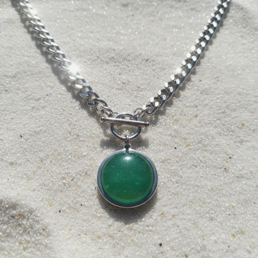 Deze elegante zilverkleurige schakelketting van roestvrij staal is 45 cm lang en afgewerkt met een opvallende edelsteen van 20 mm. De steen hangt als een subtiele eyecatcher aan de minimalistische ketting en straalt rust, optimisme en innerlijke kracht uit. De ketting is lichtgewicht en comfortabel, en past moeiteloos bij zowel boho als moderne stijlen. Draag haar solo voor een subtiele look of combineer met andere edelsteensieraden voor een gelaagde, persoonlijke stijl.