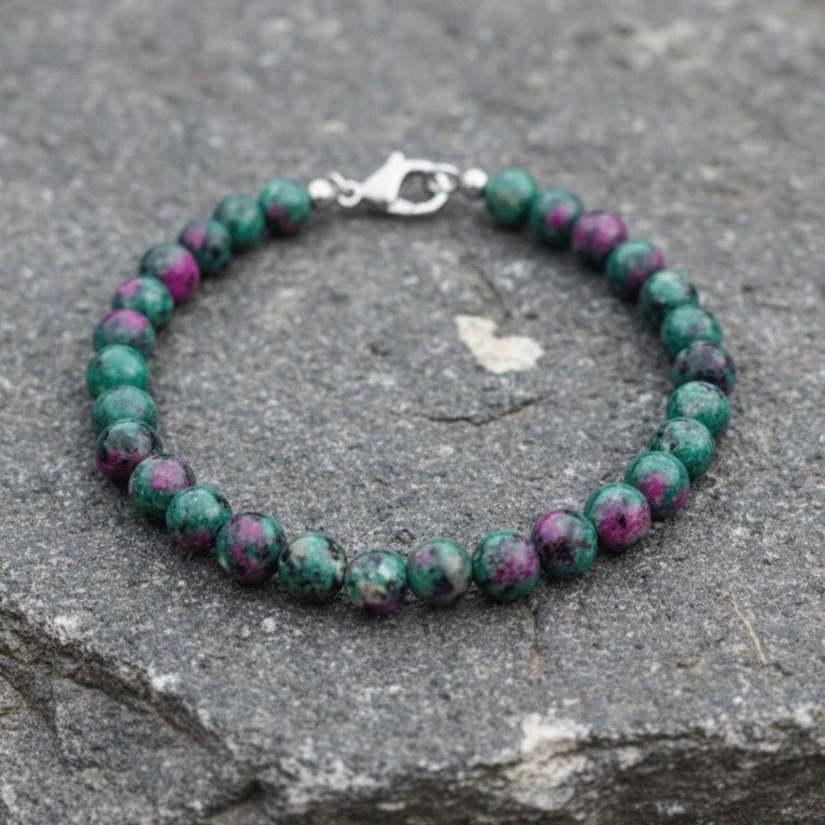 Deze handgeregen armband combineert de levendige energie van robijn met de aardse tinten van zoisiet. Robijn in zoisiet staat bekend om zijn harmoniserende werking: het stimuleert passie én rust. Een krachtig sieraad met spirituele diepgang, ideaal voor wie op zoek is naar balans, vitaliteit en een unieke uitstraling.