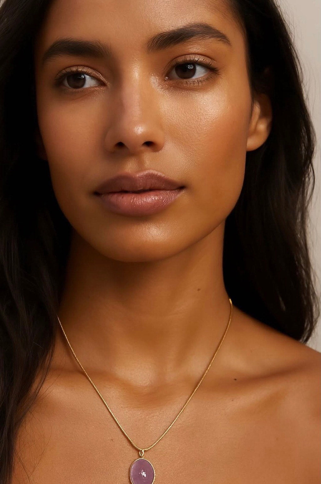 Deze roestvrijstalen snake ketting van 50 cm heeft een elegante, gladde structuur die moeiteloos aansluit op de huid. In het midden hangt een amethist edelsteen, bekend om haar kalmerende energie en spirituele diepgang. De combinatie van het glanzende gouden staal en de paarse steen zorgt voor een krachtig, maar verfijnd sieraad dat zowel stijlvol als betekenisvol is.